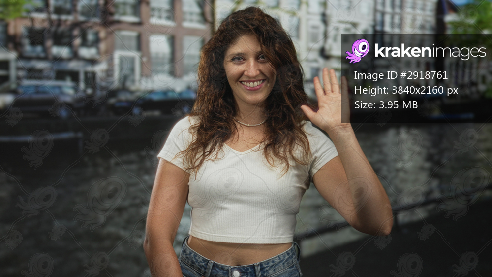 Woman waves hand on street by canal in amsterdam wearing white crop top and jeans; friendly greeting.