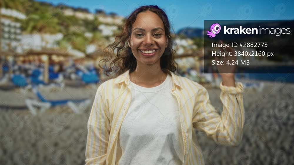 Woman waves hand and smiles showing face at beach with lounge chairs and sea in view; joy vacation carefree.
