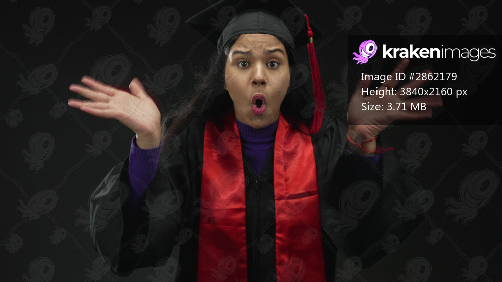 Woman waves hand wearing mortarboard black gown and red stole in studio; academic achievement success pride.