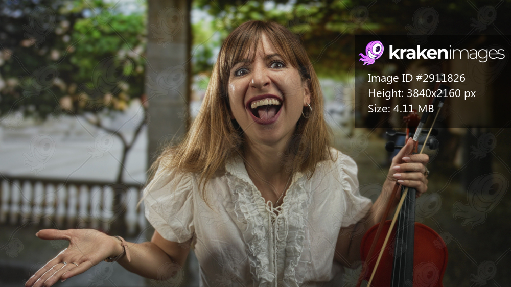 Woman waves hand while holding violin and bow by the neck on a tree lined street beside a stone building; playful joy.