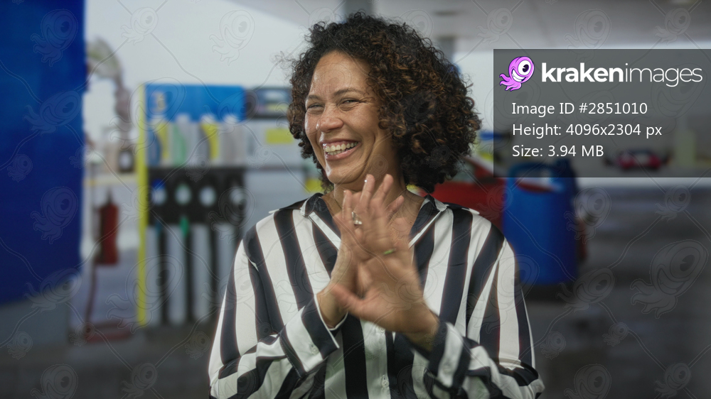 Woman waves hands near petrol station forecourt with visible fuel pumps and cars under daylight on street; pure joy.