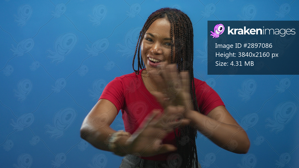 Woman waves hands and smiles in studio set with bright blue backdrop, blurred palms and braided hair visible; joy energy.
