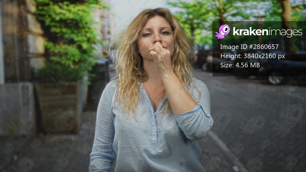 Woman waves with raised hand on a cobbled city street by parked cars and planters, wearing a light blouse and loose blonde hair; playful confidence.