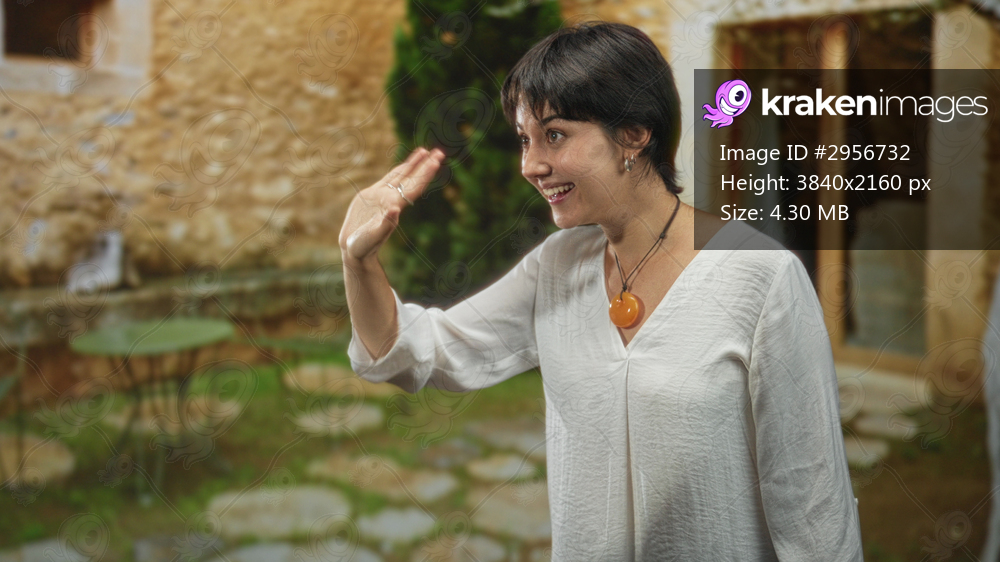 Woman waves right hand beside stone building, smiling and wearing white blouse with orange pendant and rings; friendly greeting.