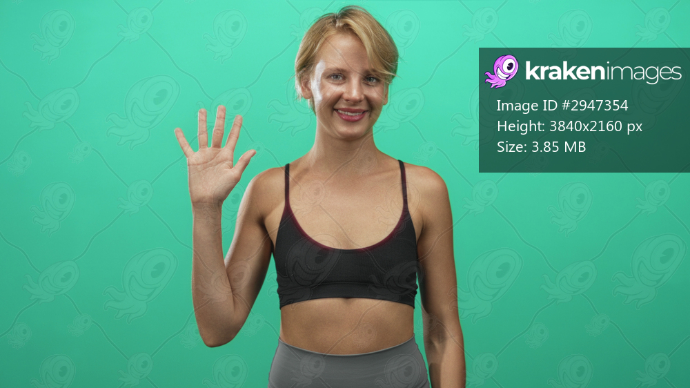 Woman waves right hand with sports bra and bare midriff visible in studio with green backdrop; welcoming fitness energy.