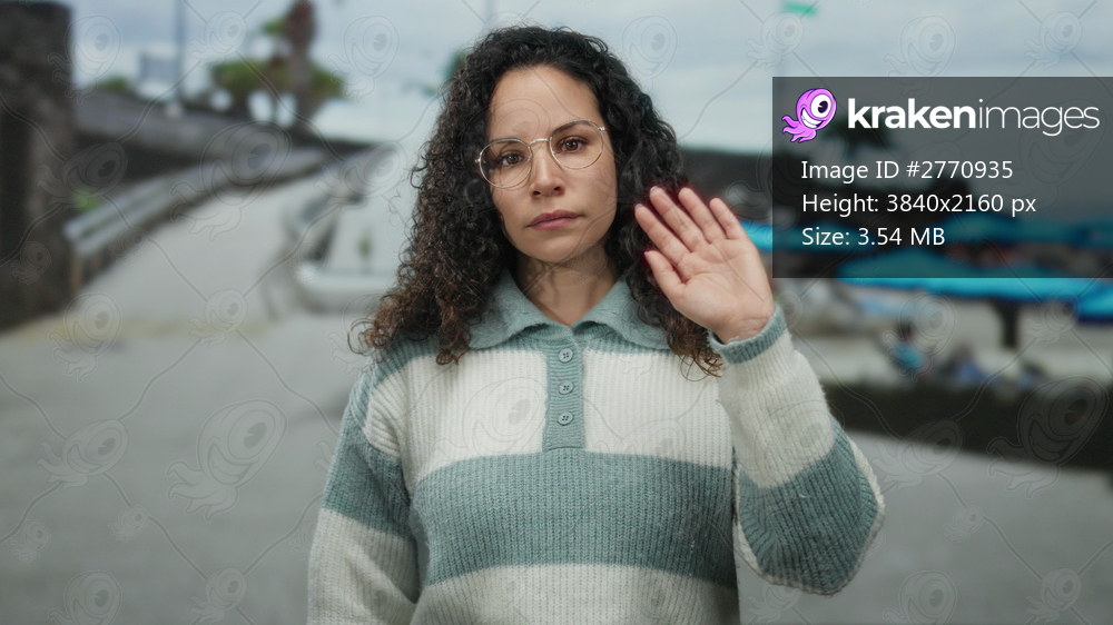 Woman waving at beach with trees and umbrellas in background, wearing glasses and striped sweater on a cloudy day.