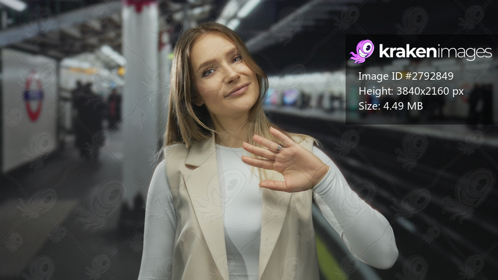 Woman waving at indoor train station platform with a smile, surrounded by blurred people and railway signs reflecting everyday travel energy.