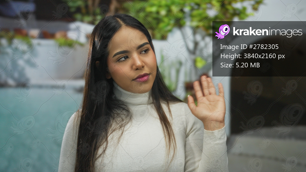 Woman waving at outdoor poolside, surrounded by greenery at a resort with a relaxed and friendly expression under sunny skies.