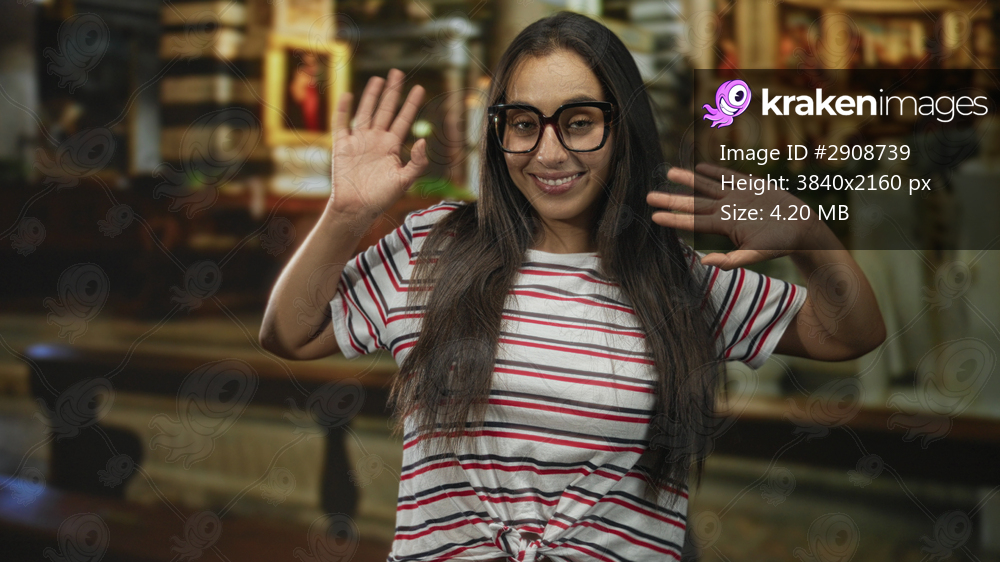 Woman waving both hands inside a catholic church wearing glasses and a striped tshirt, facing camera; serenity faith.