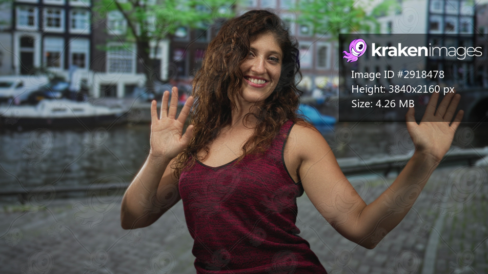 Woman waving both hands and smiling with bare arms and curly hair on a canal street in amsterdam with boats and brick quay visible; carefree joy.