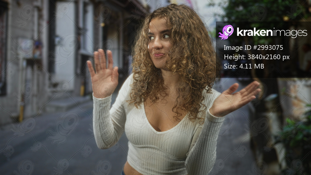 Woman waving both hands, visible cleavage in a white ribbed crop top, curly hair, smiling at camera on a narrow urban street; playful greeting.
