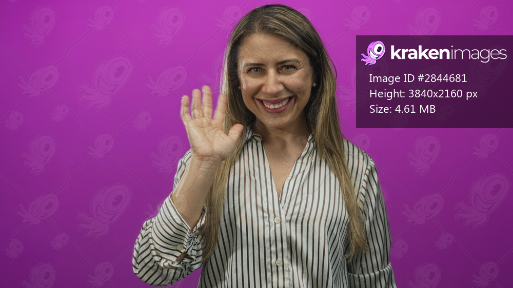 Woman waving hand in purple studio wearing striped shirt with wide smile and blonde hair; joy greeting.