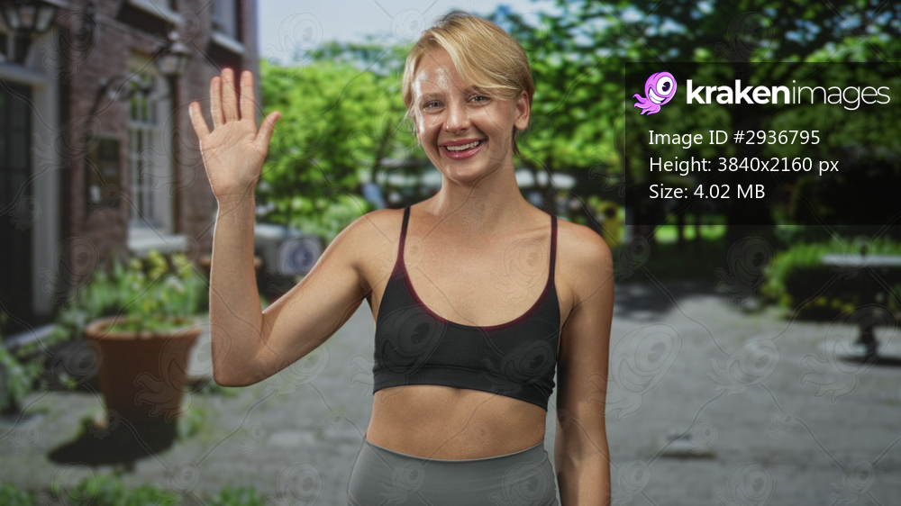 Woman waving hand in sportswear before a building courtyard, smiling and offering a greeting; welcoming happiness.