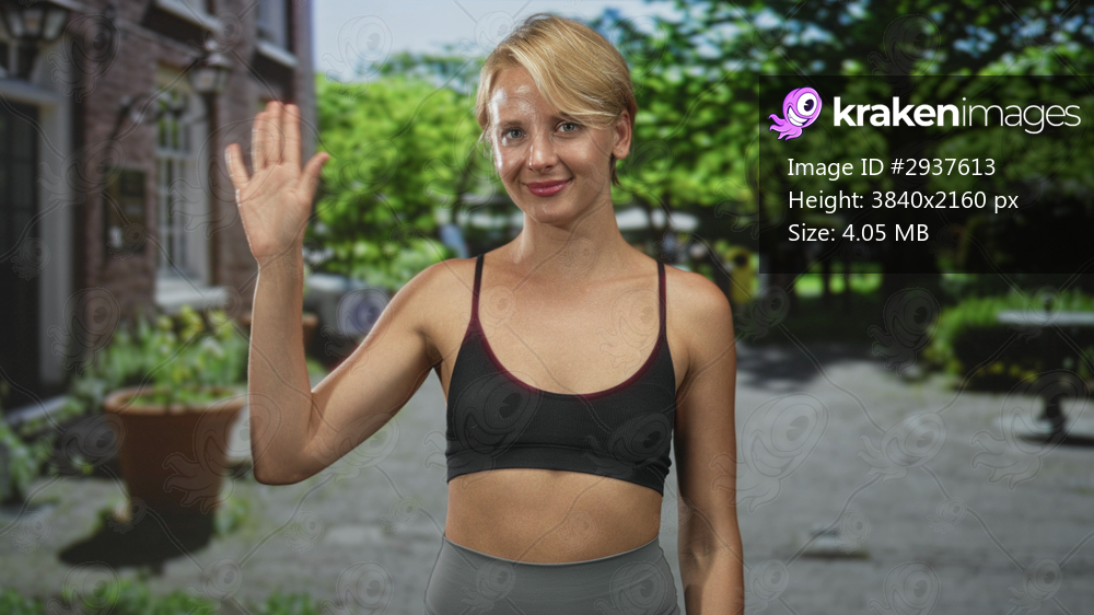 Woman waving hand in sportswear before a building courtyard, smiling and offering a greeting; welcoming happiness.