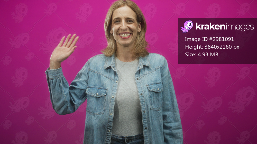 Woman waving hand in studio with magenta backdrop wearing denim jacket and jeans, smiling at camera; welcoming greeting.