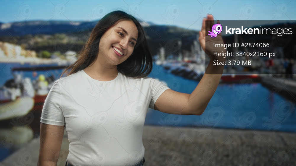 Woman waving hand on pier street by boats and harbor, smiling and leaning toward camera; joy friendly greeting.