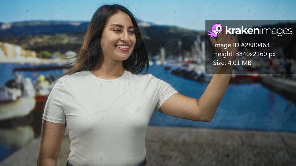 Woman waving hand on pier street by boats and harbor, smiling and leaning toward camera; joy friendly greeting.