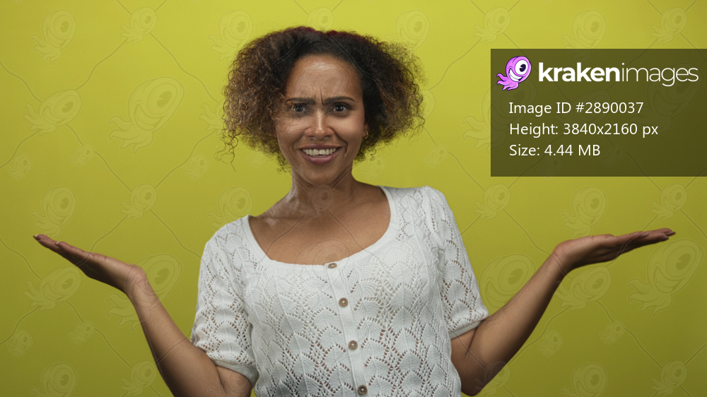 Woman waving hand with raised palm and puzzled facial expression in yellow studio wearing white knit top; confusion doubt questioning.