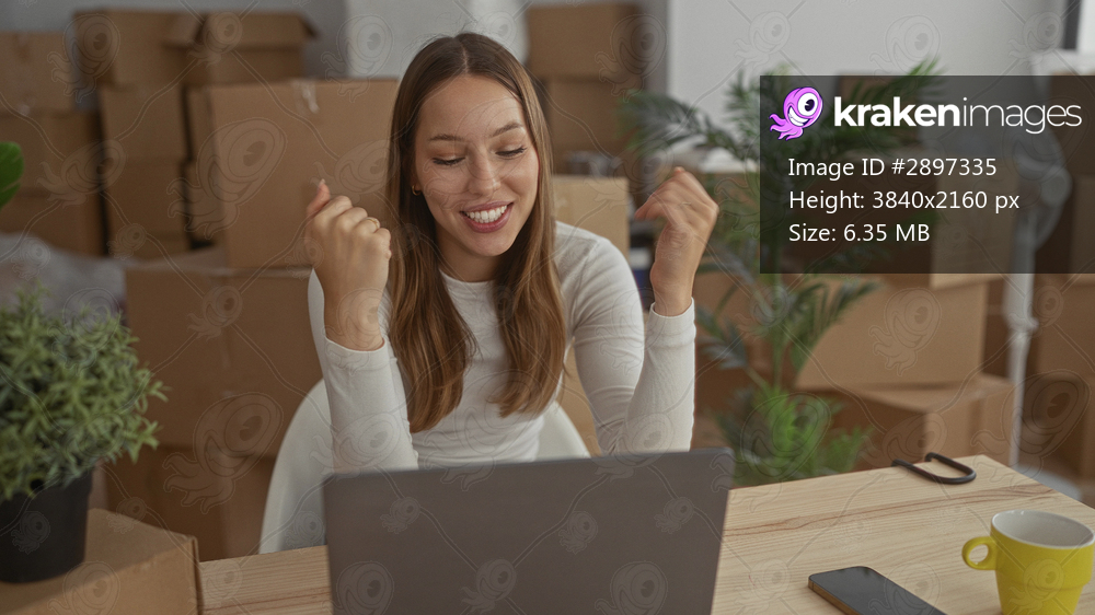 Woman waving hand to laptop in building strewn with moving boxes and houseplants; happiness new beginning.