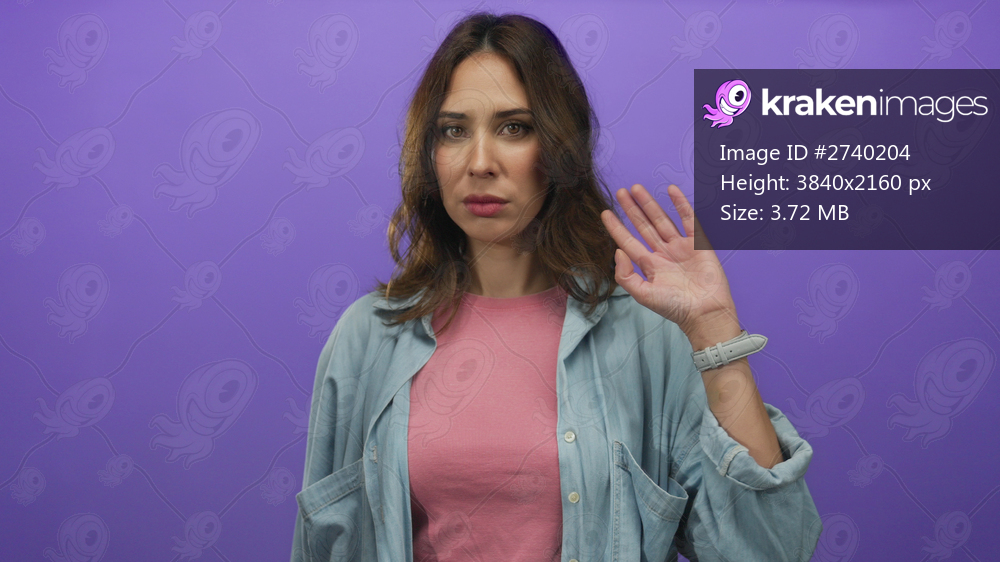 Woman waving hand wearing pink shirt and blue jacket against isolated purple background showing friendly gesture.