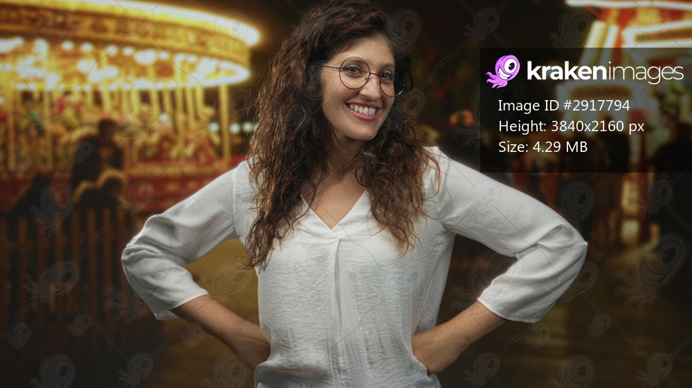 Woman waving hands at street fair at night, smiling with hands on hips and wearing glasses; joy warmth.