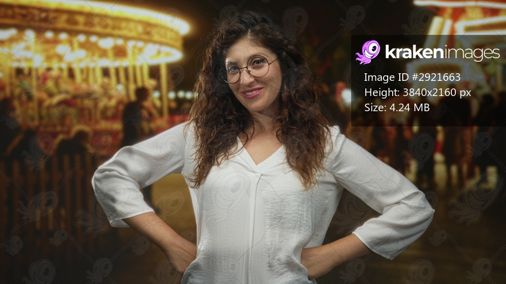 Woman waving hands at street fair at night, smiling with hands on hips and wearing glasses; joy warmth.