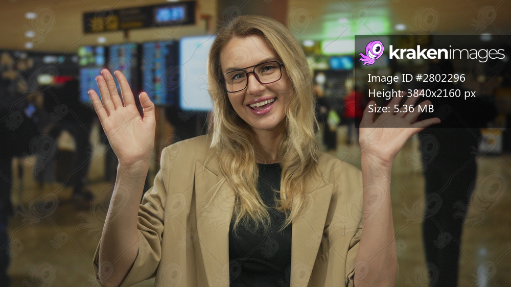 Woman waving happily at airport terminal with blurred background, capturing joyful essence of travel amidst bustling travelers and bright departure boards