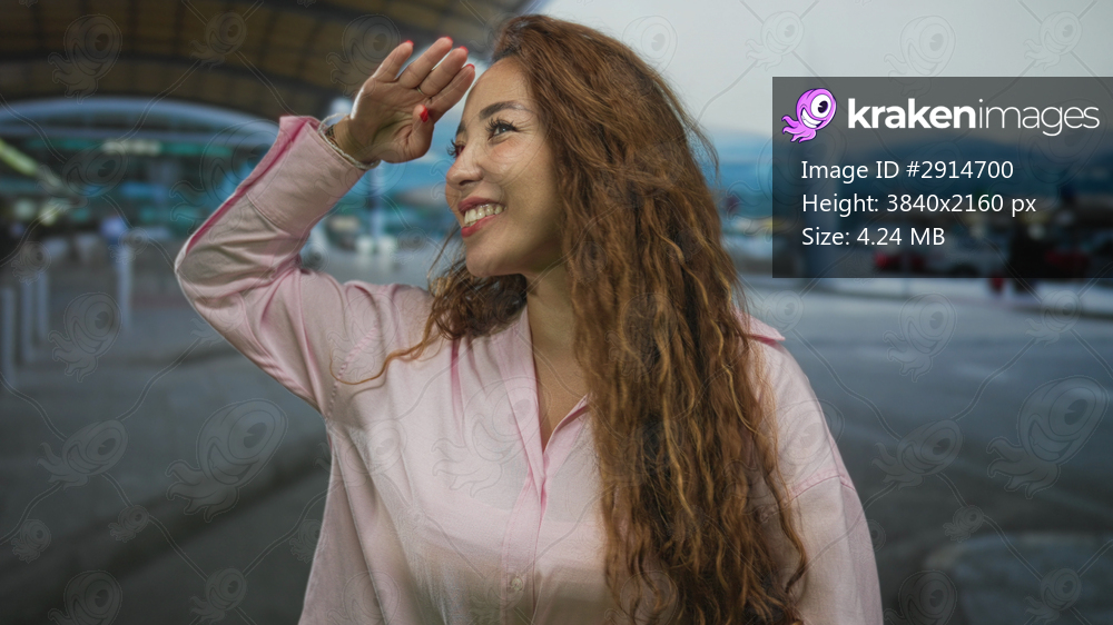 Woman waving her hand and smiling at an airport terminal curbside, facing the dropoff lane in a pink shirt; joy.