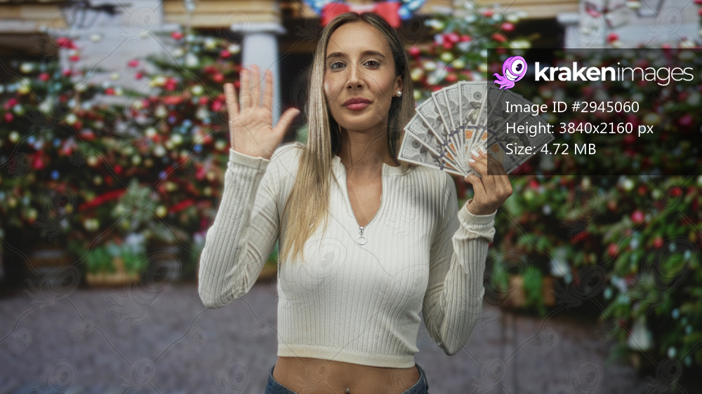 Woman waving and holding a fan of banknotes on a street with christmas trees and ornaments; prosperity joy.