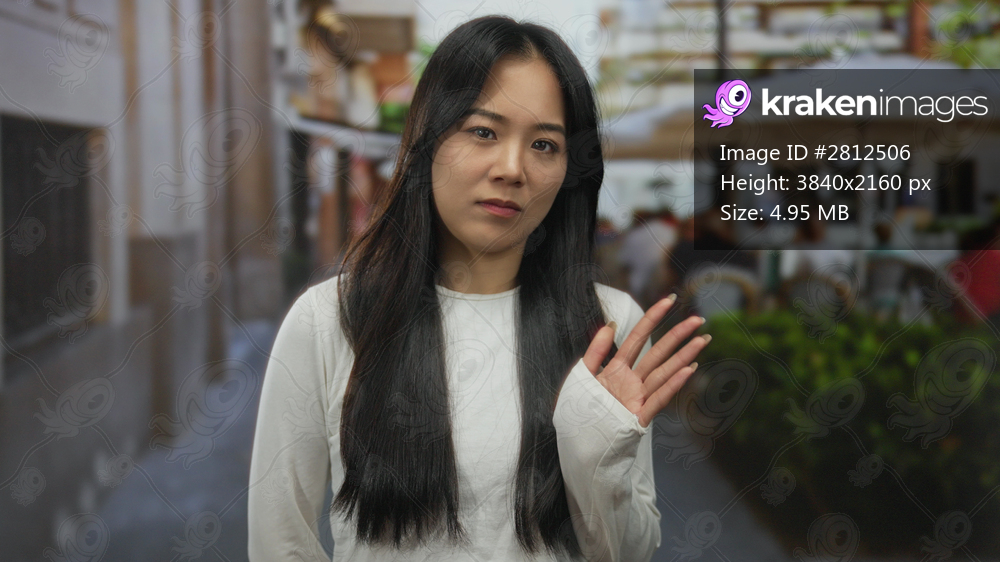 Woman waving on a bustling street terrace with people dining at a restaurant in an outdoor urban setting.