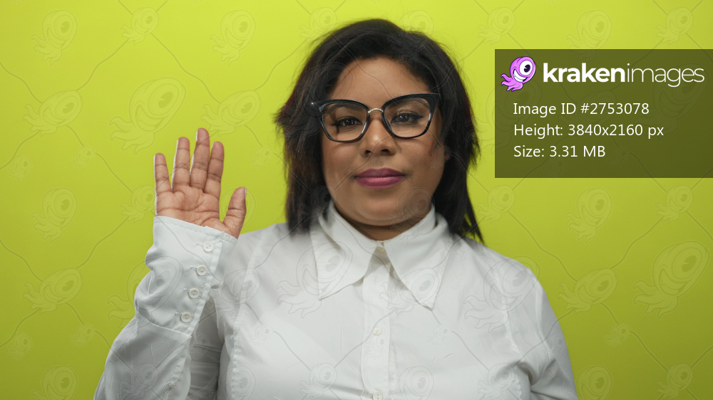 Woman waving on a vibrant yellow background dressed in a white shirt, showcasing a friendly demeanor, with clear eyeglasses, suggesting a cheerful, approachable interaction. - Kraken Images