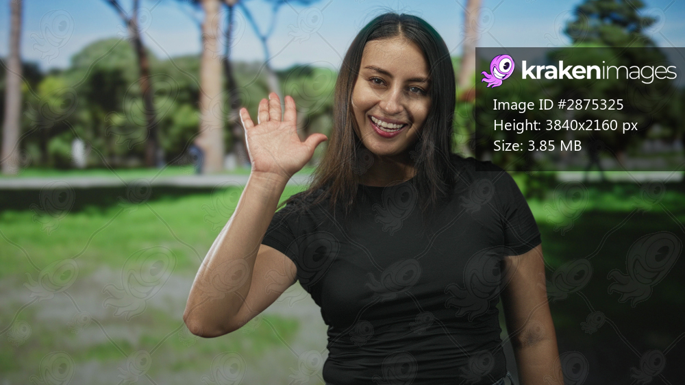 Woman waving right hand in park beside sunlit grassy lawn and tall trees while smiling at camera with open palm; friendly greeting happiness.