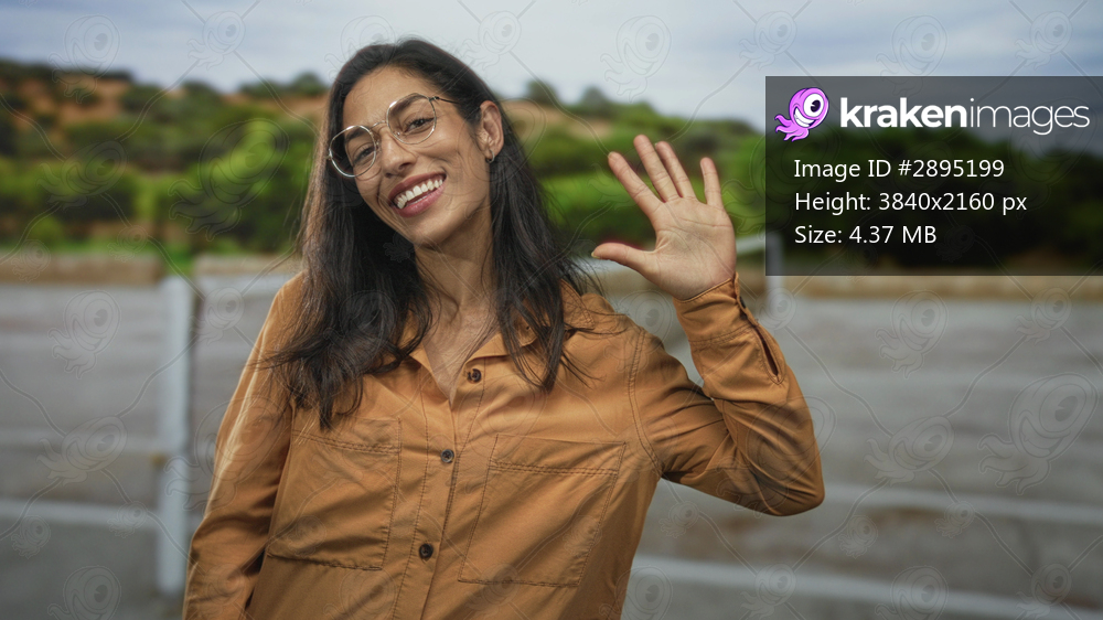 Woman waving right hand on outdoor tennis court near net, wearing glasses and orange shirt, smiling at camera; friendly greeting joy.