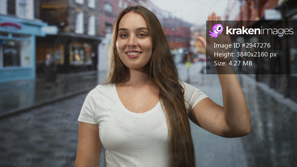 Woman waving right hand on wet city street in white t shirt, standing facing camera with slight smile; casual confidence.