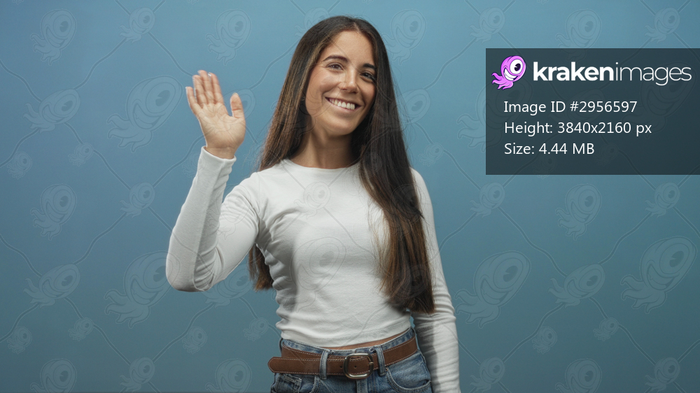 Woman waving right hand with visible palm in studio against blue wall, long hair, white top and jeans; welcoming smile.