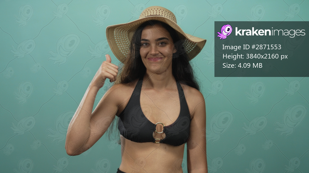 Woman wearing a black bikini top and wide brim straw hat making ok sign in mint green studio setting; approval.