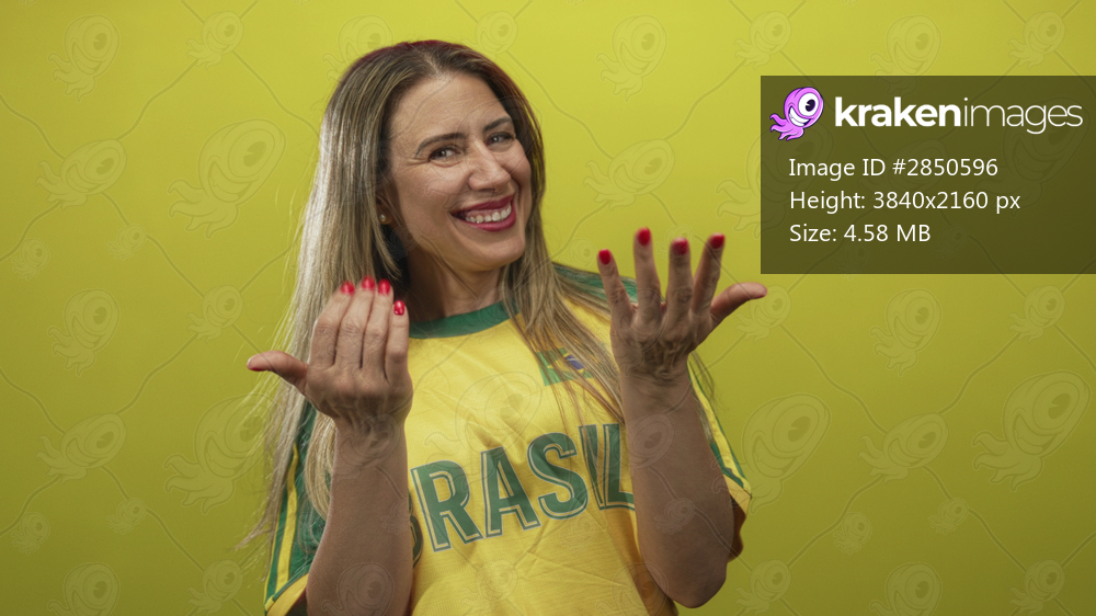 Woman wearing a brazil jersey beckons with hands and bright smile in yellow studio setting; welcoming.