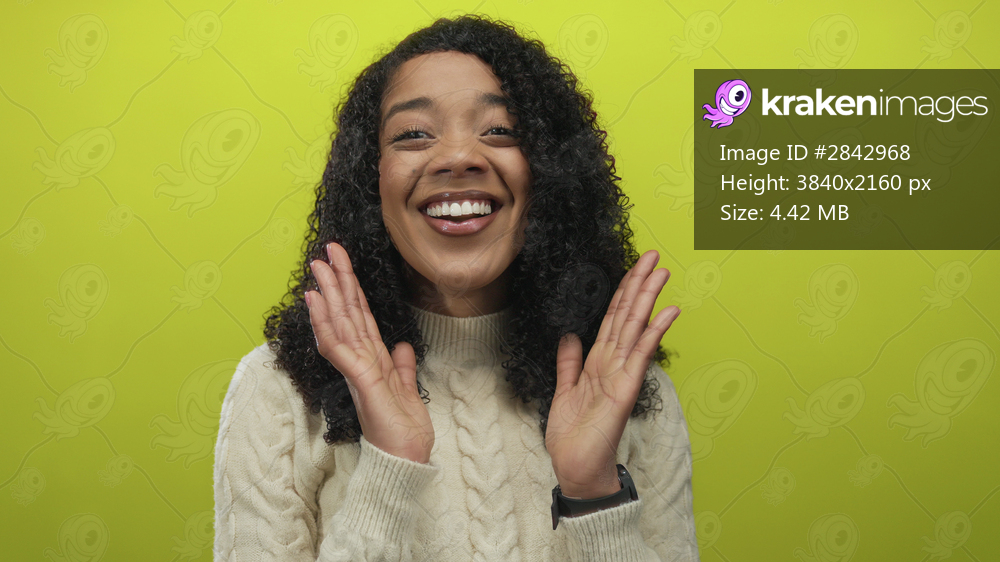 Woman wearing a cable knit sweater smiling and showing teeth in studio with lime green background; confidence.
