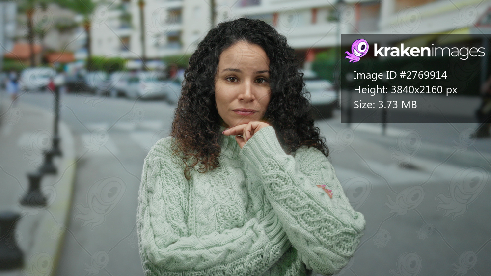 Woman wearing a cozy green sweater stands on an urban street with cars in the background, showcasing a thoughtful expression in a vibrant outdoor city setting. - Kraken Images