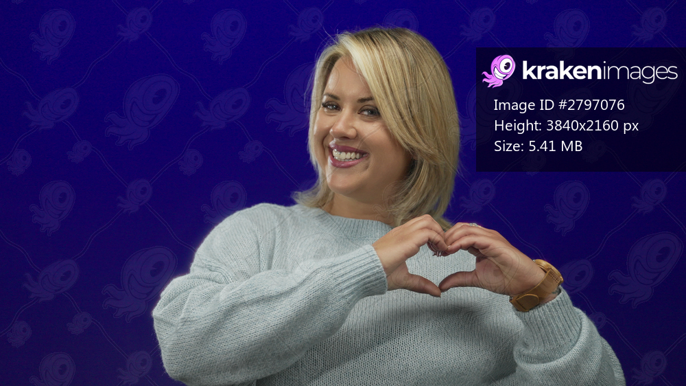 Woman wearing a cozy sweater and smiling gently while forming a heart gesture with hands in a blue studio setting; love joy.