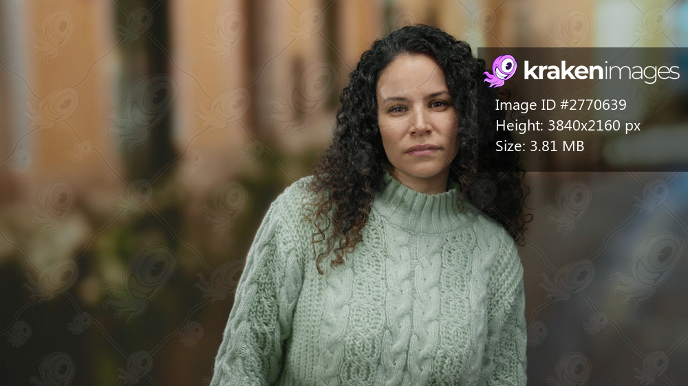 Woman wearing a cozy sweater stands on a quiet street exuding a sense of tranquility with her relaxed expression and curly hair under a soft natural light outdoors. - Kraken Images