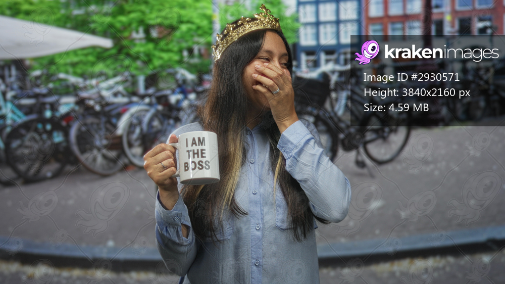 Woman wearing a crown holding a mug that reads i am the boss with hand covering mouth on street lined with bicycles and tall canal buildings in amsterdam; joy confidence empowerment. - Kraken Images