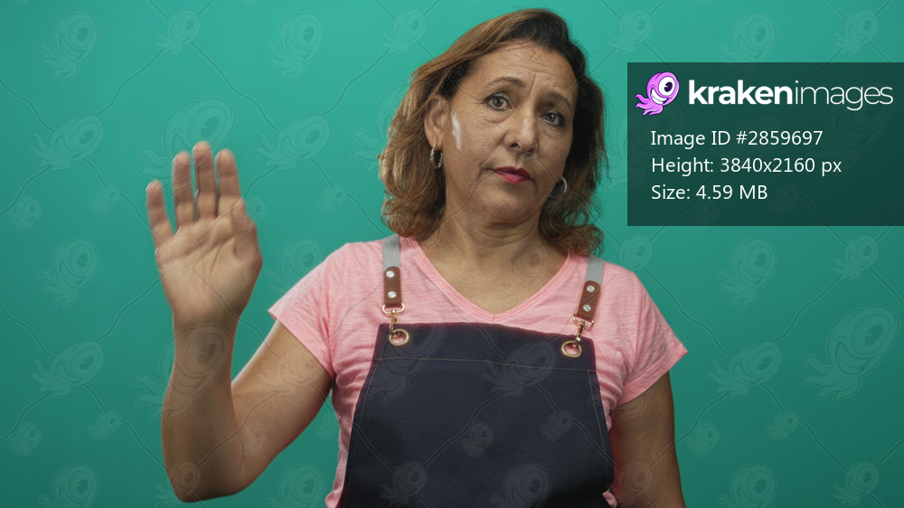 Woman wearing a denim apron waves bare hand in studio before a teal wall while looking at camera; calm focus.