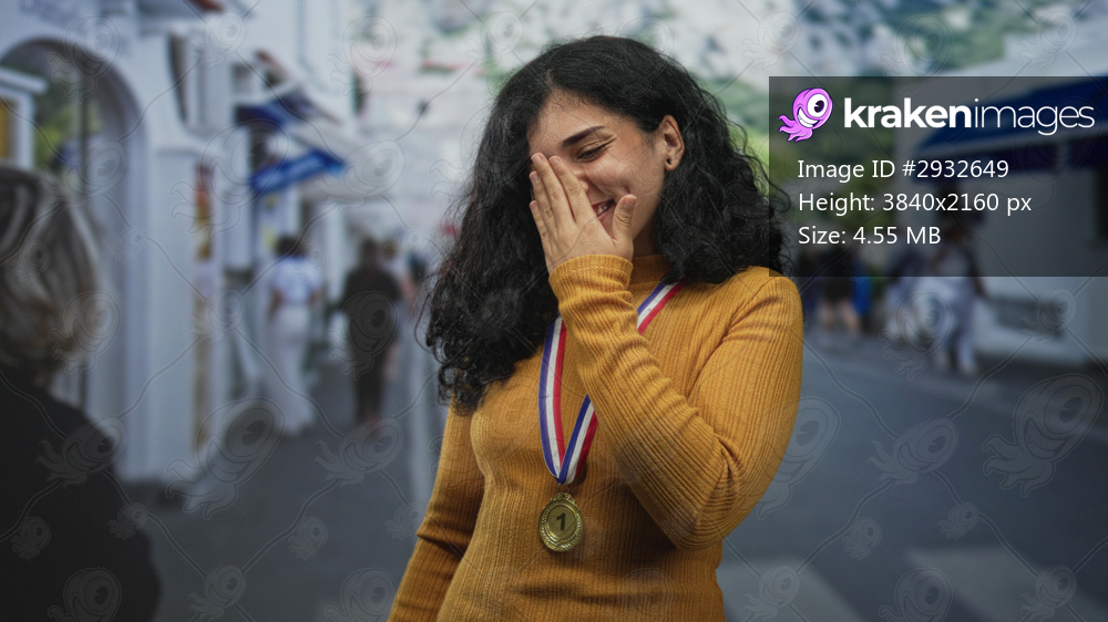 Woman wearing a first place medal covers mouth with hand while smiling on a busy city street with pedestrians nearby; shy surprise.