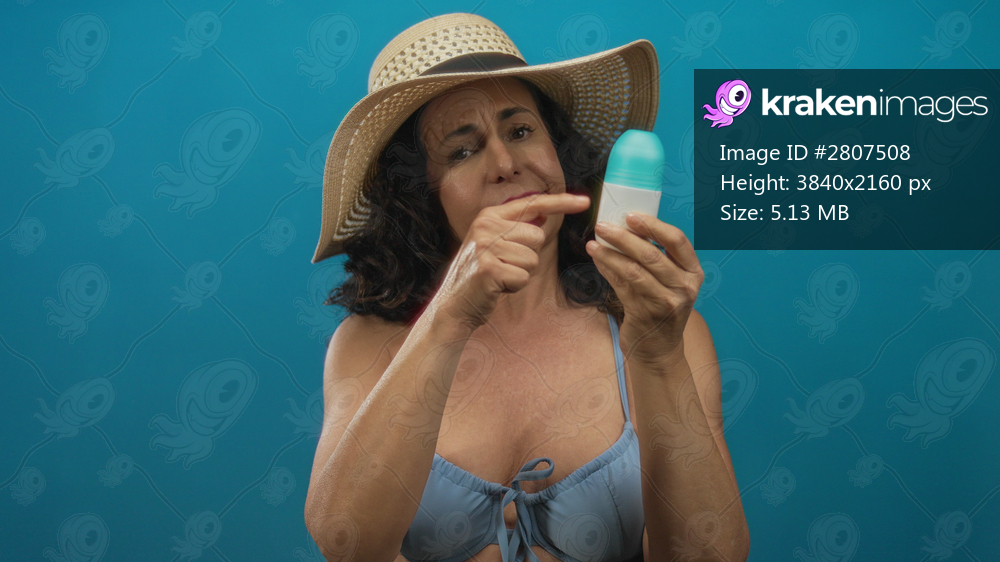 Woman wearing a hat and bikini examines lotion bottle against isolated blue background, exuding an inquisitive expression while maintaining a relaxed summertime vibe. - Kraken Images