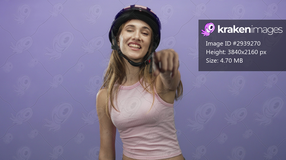 Woman wearing a helmet and pink tank top raises her right arm and smiles in a studio with a purple wall; youthful joy.