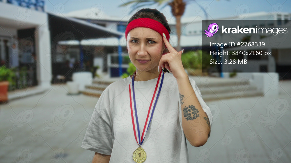 Woman wearing a medal and red headband stands on a city street with a puzzled expression, reflecting outdoor urban life.