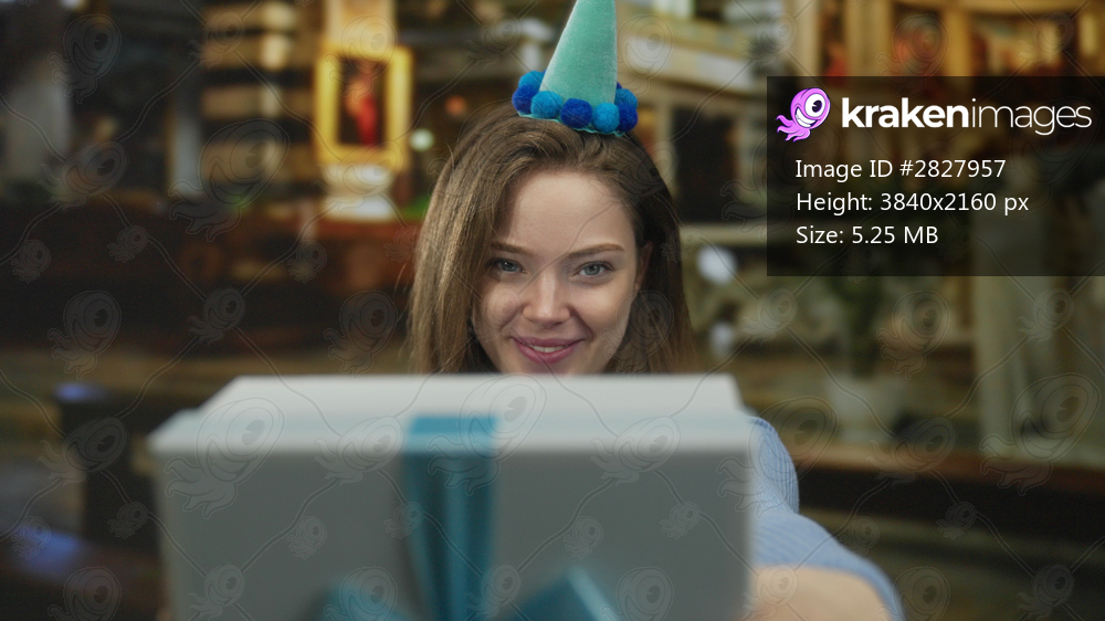 Woman wearing a party hat holds a blue gift box inside a candlelit building while smiling; happiness.
