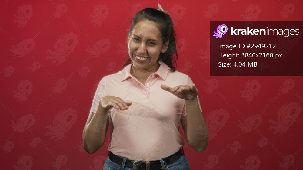 Woman wearing a pink polo and jeans gesturing with both hands palms down close to chest in a red studio setting, casual belt visible; playful smile.