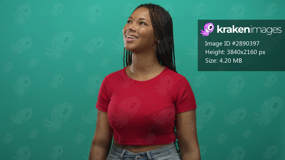 Woman wearing a red crop top and denim jeans stands smiling and looking up with braided hair, casual pose in a studio teal backdrop; optimism confidence. - Kraken Images
